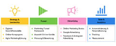 Mit der Einführung der Virtual Labs steht das Lernangebot von Headstart Studios nun auf vier Säulen, die für das Marketing in Unternehmen am relevantesten sind: Strategy & Leadership, Funnel, Advertising und Data & Analytics.