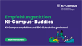 Der KI-Campus setzt zum Jahresbeginn die Empfehlungsaktion "KI-Campus-Buddies" um, um noch mehr Menschen für das Thema KI zu begeistern. Nutzer:innen des KI-Campus, die die Lernplattform weiterempfehlen, können Gutscheine für ihren nächsten Online-Einkauf gewinnen. Wenn sich ihr "KI-Campus-Buddy" bis zum 29. Februar auf dem KI-Campus registriert, nehmen beide an der Verlosung von 20 x 2 Gutscheinen über je 50 Euro teil.